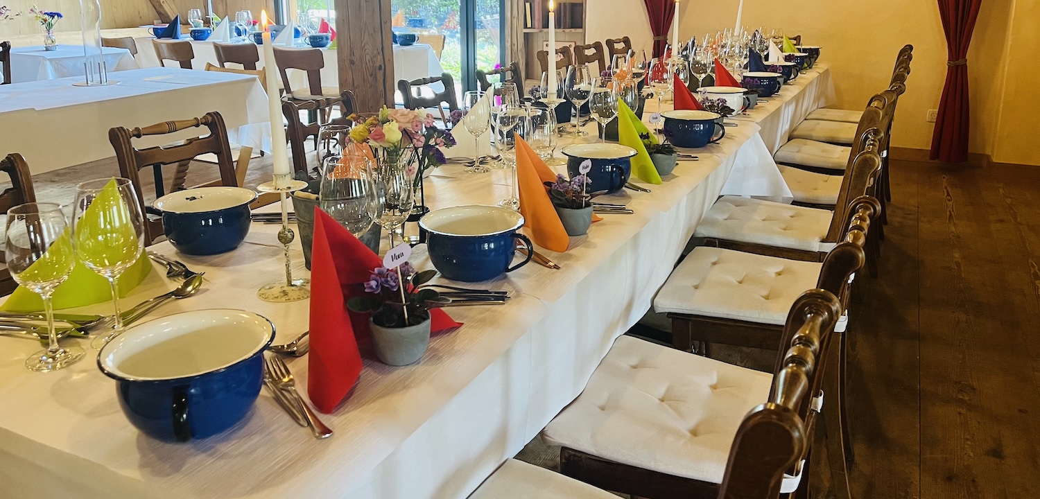 Die Mitte unseres Raumes ist gekrönt mit unserer Lausbuben Tafel - bei dieser blicken hinter dem Vorhang schelmisch Max & Moritz hervor. An dieser Tafel finden Gäste bis zu 18 Personen Platz. Die Tafel kann auch für einzelne kleinere Gruppen genutzt werden.